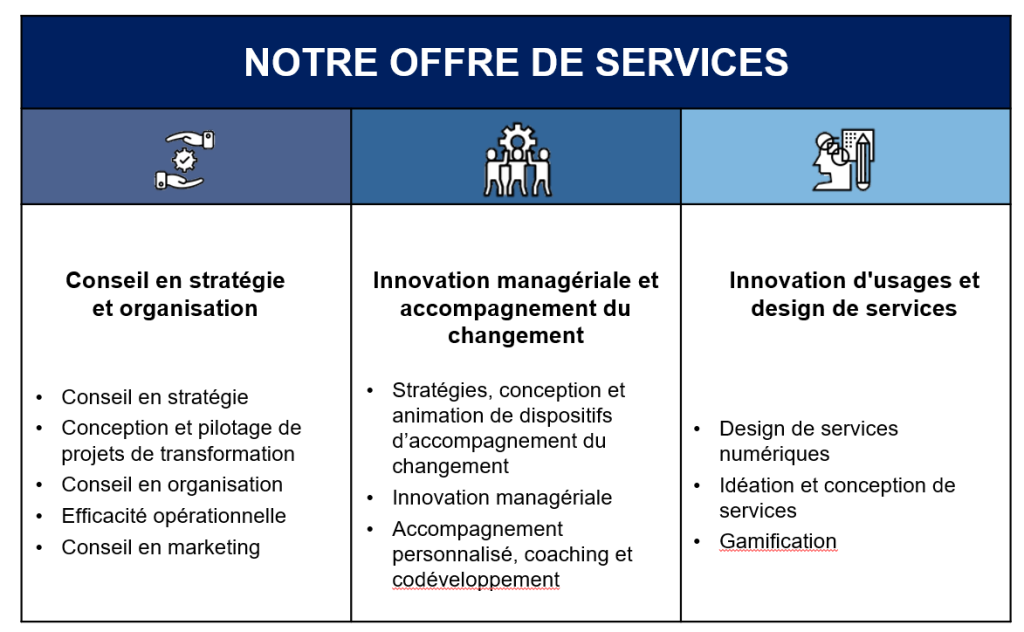 L’AMC s’appuie sur un panel d’expertises large pour concevoir et accompagner les transformations du ministère : Conseil en stratégie et organisation, Excellence Opérationnelle, Design de Services, Démarches d’innovation, Conduite du changement, Coaching, etc… sont mis en œuvre pour accompagner des transformations d’ampleur ou intervenir sur des appuis spécifiques.
